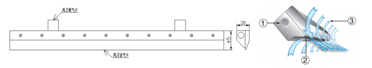 ③而形成一面薄薄的高强度、大气流的冲击气幕,气幕强非常均匀。气刀具有噪音低(69db)分贝以下,耗气量少,表面经过电镀氧化处理,使用寿命10年以上,用起来节省90%以上等优点。